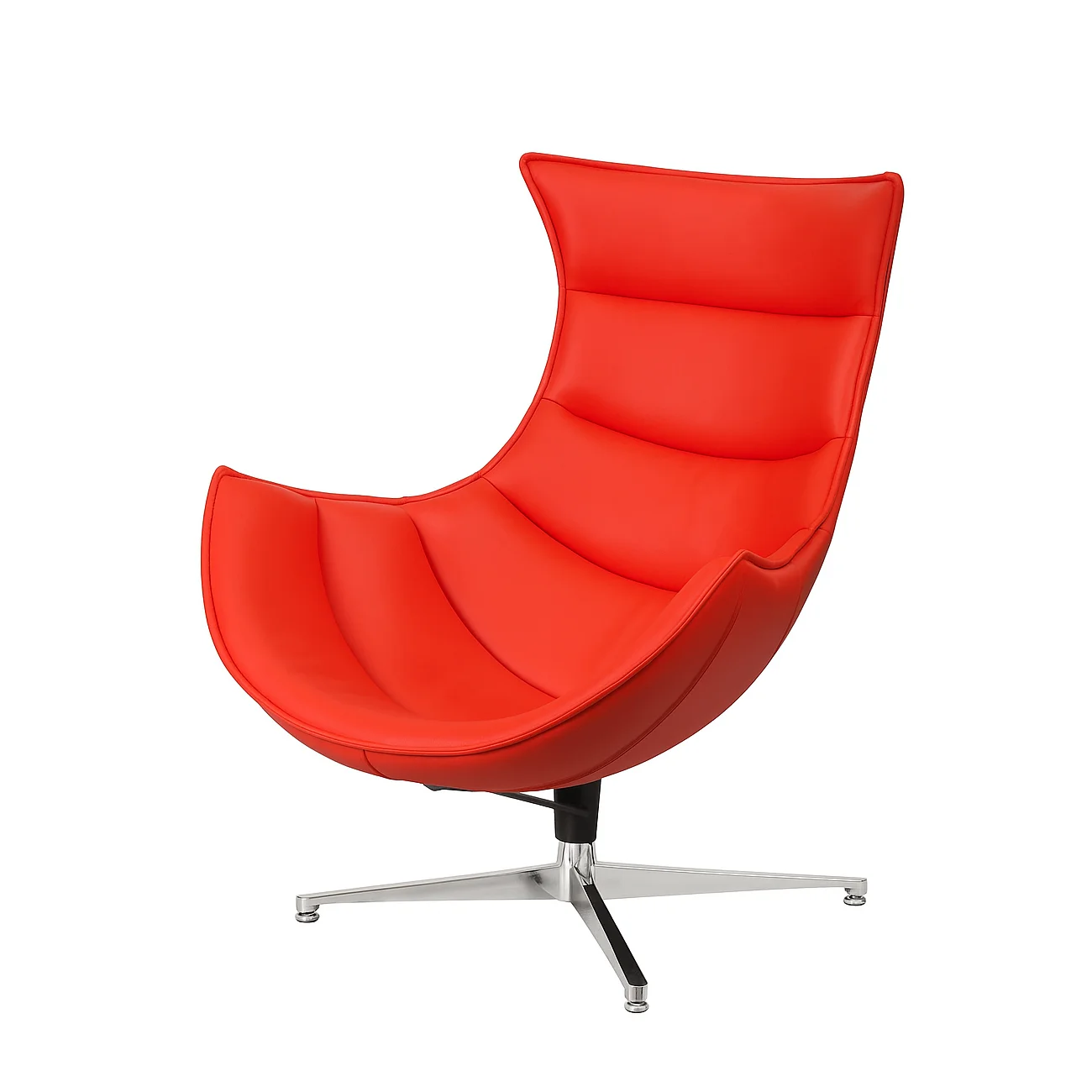 This bold and sophisticated retro-inspired lounge chair features genuine leather upholstery with sweeping curves and a deep, contoured seat that invites you to sink in and relax. The sculptural high back offers ample support, while horizontal channel tufting adds a touch of modern flair. Perched on a polished aluminum swivel base with a 4-star leg design, this chair blends mid-century elegance with contemporary comfort—perfect for a stylish living room, office, or reading nook.