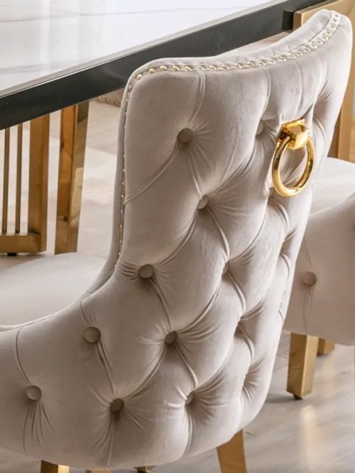 Creme Velvet Dining Chair with Large Knocker, Polished Gold Frame, Deep Tufting back and Nail Head Details.