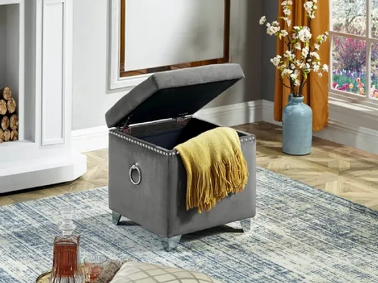 Grey Velvet Storage Ottoman with Deep Tufting, Chrome Ring, Nailhead Details and Chrome Legs