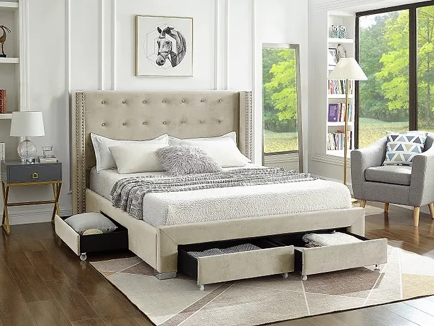 - Creme Velvet Fabric Wing Bed with Nailhead Details and Chrome Legs.